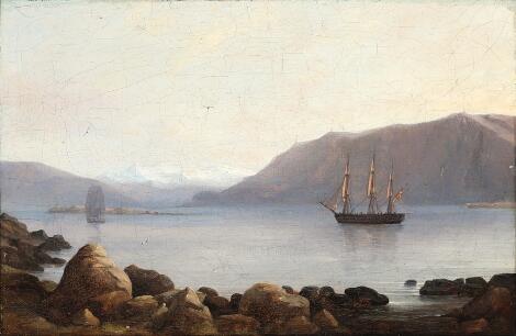 2551/109LyngbyUbekendt maler, 19. årh.: Galatea i en grønlandsk fjord. Utydelig sign. Olie på lærred. 22 x 33 cm.