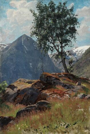 2551/115LyngbyHans Dahl: Udsigt over et norsk fjeld. Dobbeltsign. Hans Dahl 27. Juni 95. Utydelig betegnelse. Olie på lærred monteret på træ. Lysmål 52 x 35 cm.
