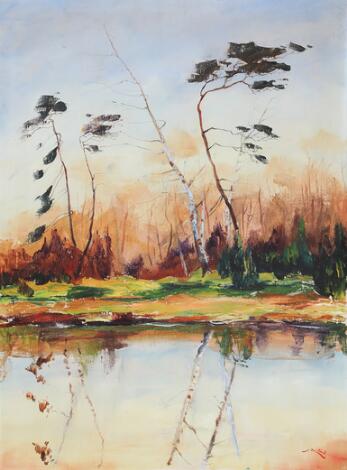 2551/100AarhusAxel Lind: Efterårslandskab fra en sø. Signeret Axel Lind. Olie på lærred. 99 x 74 cm.
