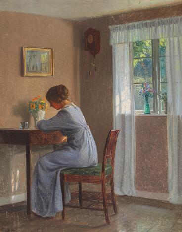 2551/10AarhusAlfred Broge: Interiør med en kvinde ved skrivebordet og sollys gennem vinduet. Signeret. Olie på lærred. 69 x 54 cm.