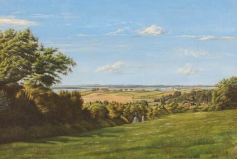 2551/52AarhusUbekendt maler, 19. årh.: Sommerligt landskab med en gående mor og sit barn. Signeret. Olie på lærred. 40 x 58 cm.