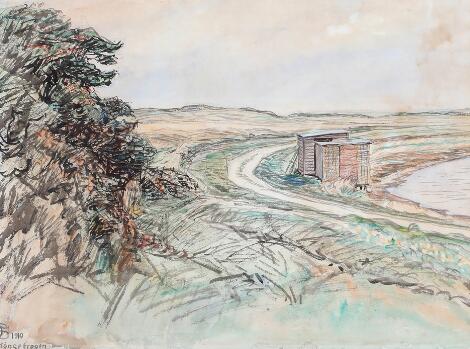 2551/136AarhusFritz Syberg: Familen Sybergs sommerbolig ved Fynshoved, Hønsekrogen. Signeret. Akvarel på papir. Lysmål 44,5 x 60 cm.