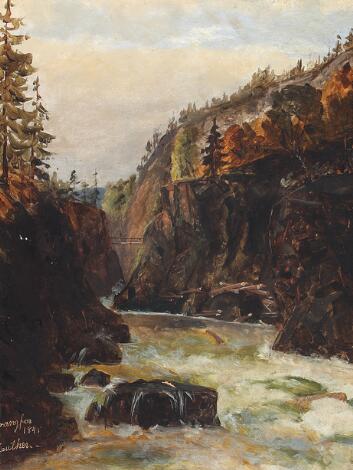 2551/64AarhusC. O. Zeuthen: "Wrangfos", parti med norsk flodlandskab, 1845. Sign. Zeuthen 1845. Olie på papir, monteret på lærred. 35 x 27 cm.