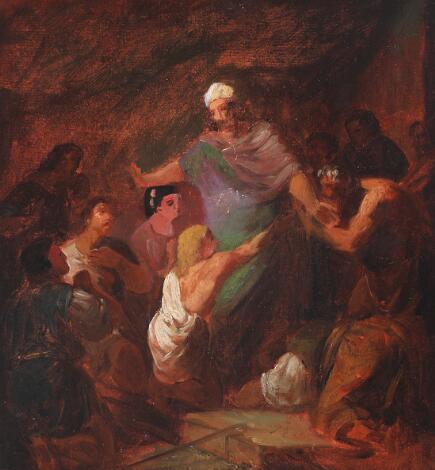 2551/106AarhusAugust Thomsen: Religiøs scene. Usigneret. Olie på papir, monteret på lærred. 31,5 x 28,5 cm.
