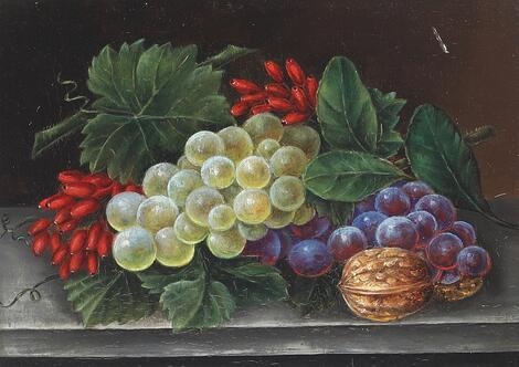 2551/58AarhusI. L. Jensen, skole, 19. årh.: Opstilling med frugter og blade. Usigneret. Olie på træ. 15,5 x 21.