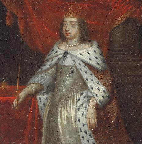 2551/124AarhusUbekendt maler, 18. årh.: Portræt af den franske dronning, Anne af Østrig (1601-1666). Usigneret. Olie på kobberplade. 13 x 13 cm.
