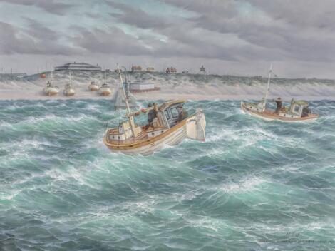 2551/142AarhusWolmer Zier: "Fiskerbåde vender hjem til Løkken i hårdt vejr". Signeret. W. Zier. Olie på lærred. 76 x 101 cm.