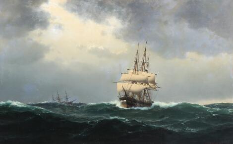 2551/28AarhusCarl Baagøe: Tremastet fregat i hård vind. Signeret Carl Baagøe 71. Olie på lærred. 130 x 83 cm.