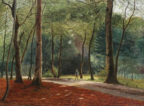 2551/40AarhusJulius Petersen: Efterårslandskab fra skoven med en mand der lufter sin hund. Signeret. Olie på lærred. 82 x 111 cm.