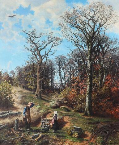 2551/46AarhusCarl Milton Jensen: En brændehugger får besøg. Signeret. Milton Jensen 1885. Olie på lærred. 152 x 126 cm.