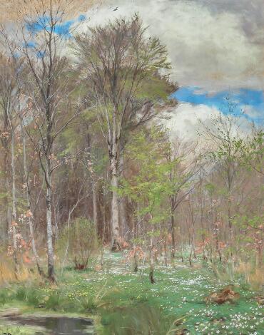 2551/4AarhusH. A. Brendekilde: Nyudsprungne anemoner i en forårsskov. Signeret monogram. Olie på lærred. 77 x 96 cm.