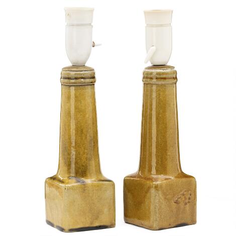 2551/522LyngbyKähler: A pair of stoneware table lamps. Conical stems on square bases. Decorated in yellowish glaze. (2)