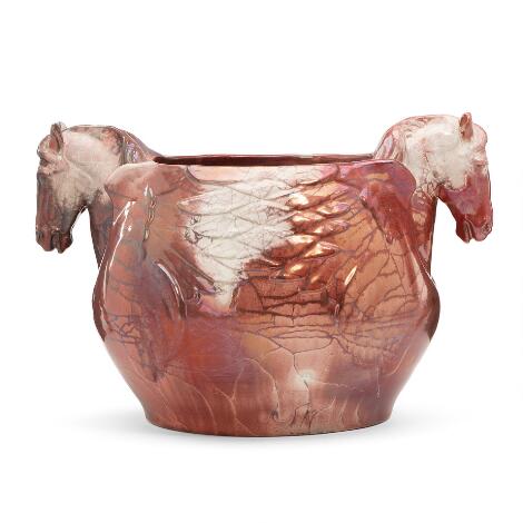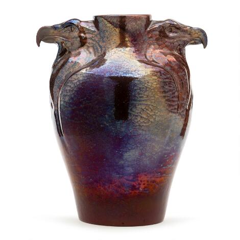 2551/510LyngbyKarl Hansen Reistrup: “Ørnevasen". An earthenware vase modelled with two eagle-heads. Decorated with red lustre glaze. Made by Kähler.