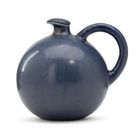 2551/507LyngbySaxbo: A circular stoneware jug and stopper decorated in dark blue glaze with olive green and white elements.