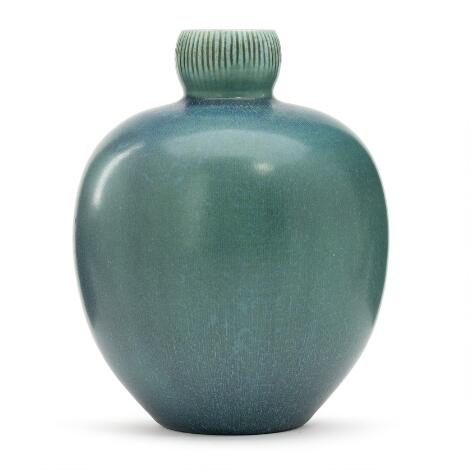 2551/504LyngbySaxbo: A circular stoneware vase decorated with turquoise glaze with blue elements. 1937-1949. H. 19 cm.