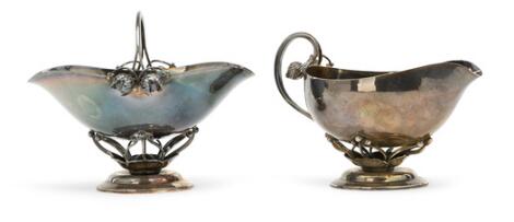 2551/546LyngbyGeorg Jensen: A sterling silver creamer and sugar bowl with hammered surface and floral decoration in relief. (2)