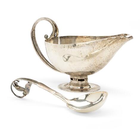 2551/552LyngbyJohan Rohde, Georg Jensen: A silver sauce boat and sauce spoon with hammered surface. Georg Jensen 1920 and 1926. (2)