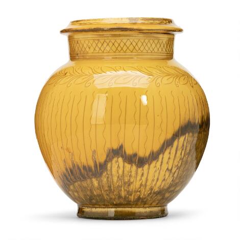 2551/516LyngbyKähler: An earthenware vase modeled in circular shape with sgraffito decor. Decorated with yellow uraninum glaze. H. 17.8 cm.