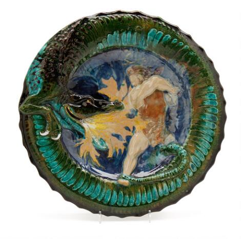 2551/549LyngbyKarl Hansen Reistrup: Large, circular eartheware dish modeled with Thor and the Midgard serpent in relief. Diam. 43.5 cm.