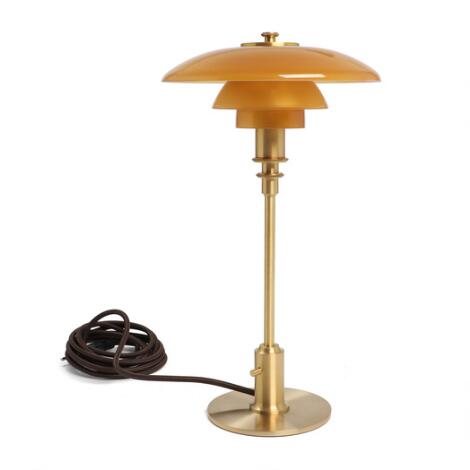 2551/536AarhusPoul Henningsen: "PH-2/1". Table lamp with frame of brass, shades of amber glass. Made by Louis Poulsen, 2024. H. 36 cm.