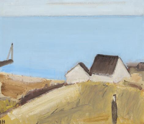 2551/657AarhusJohannes Hofmeister: Costal scenery with house and figure. Signed JH. Oil on masonite. 60 x 70 cm.