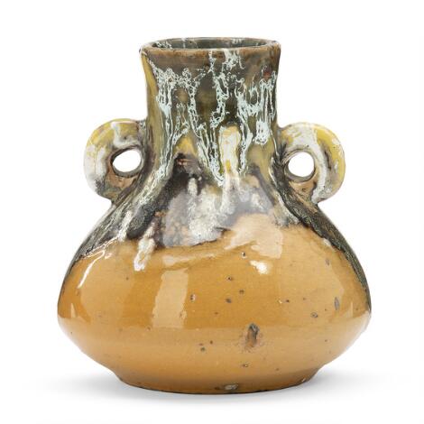 2551/621LyngbyPatrick Nordström: A small stoneware vase modelled with two round handles. Decorated with clear and polychrome glaze. H. 11.8 cm.