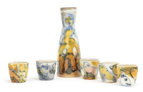 2551/645LyngbySten Lykke Madsen: A porcelain sake set comprising a pitcher and five mugs. Decotated with polychrome glaze. (6)