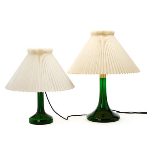 2551/642LyngbyPoul Christiansen, Gunnar Biilmann Petersen: Two table lamps of green glass with pleated acrylic shades. Made by Holmegaard for Le Klint. (2)