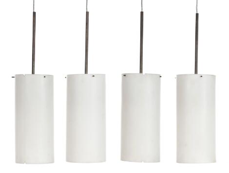 2551/676AarhusErik Møller: "Acrylcylinder". Four brass pendants with cylindrical white acrylic shade. Manufactured by Louis Poulsen. 1960s. Shade height 48.5 cm. (4)