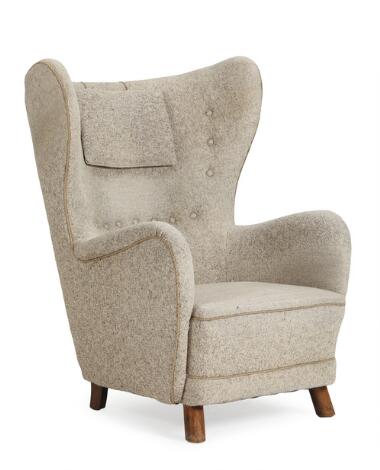 2551/667AarhusDanish furniture design: Wingback chair with beech legs, upholstered with grey wool. 1930-40s.