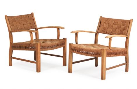 2551/641AarhusDanish furniture design: A pair of easy chairs with beech frame. Seat and back stretched with woven seagrass. 1940s. (2)