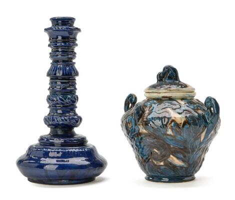 2551/636LyngbySvend Hammershøi: An earthenware lidded jar and candlestick. Made by Kähler. H. 20 and 29.5 cm. (2)