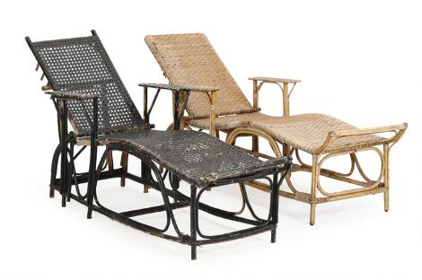 2551/1042AarhusUnknown furniture design: Two adjustable bamboo, rattan and wickerwork chaise longues. 1930-40s. L. 160-200 cm. (2)