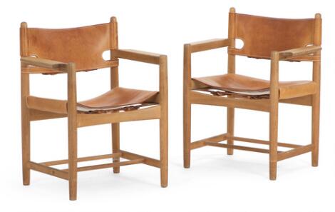 2551/1026LyngbyBørge Mogensen: A pair of oak armchairs. Seat and back with patinated full grain leather. Manufactured by Fredericia Stolefabrik. (2)