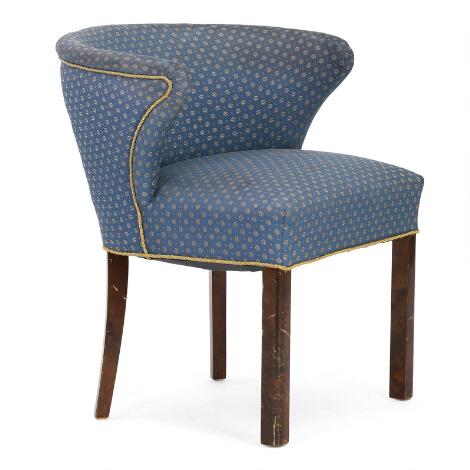 2551/1005LyngbyDanish cabinetmaker : Armchair with stained birch legs. Upholstered with blue, patterned fabric.