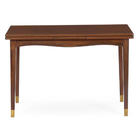 2551/1006LyngbyDanish cabinetmaker: Mahogany coffee table with brass shoes. Top with two pullout leaves.