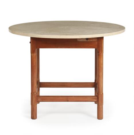 2551/1041AarhusDanish cabinetmaker: A mahogany gaming table with four drawers and grey marble top. 1930s. H. 65.5. Diam. 90 cm.