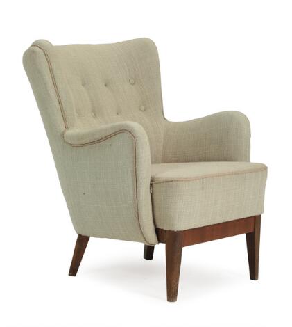 2551/1045AarhusDanish furniture design: Easy chair with dark stained beech frame, upholstered with light fabric. 1940s.