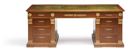 2551/3070LyngbyA French Empire style mahogany and gilt bronze mounted partners desk with gilt tooles green leather top. C. 1900. H. 75 cm. L. 200 cm. W. 90 cm.