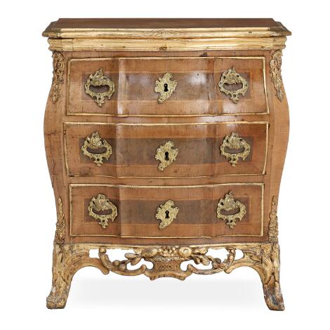 2551/3076LyngbyA Danish rococo commode of giltwood and walnut, later wooden top. Partly mid-18th century. H. 81 cm. W. 67 cm. D. 51 cm.