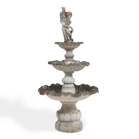 2551/3065LyngbyA 20th century artificial stone fountain with a figure in shape of puto on the top. H. 195 cm.