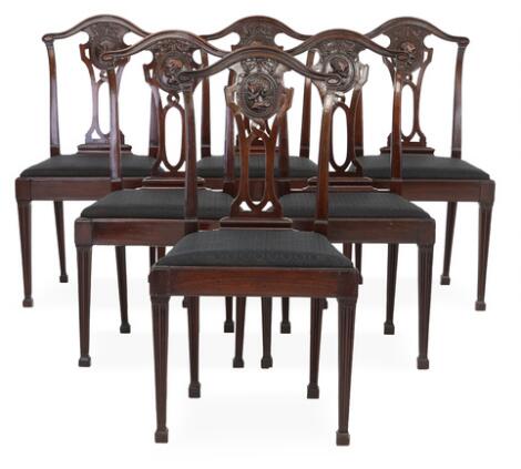 2551/3119Lyngby6 German mahogany chairs, back decorated with portraits in relief, tappered fluted legs, horsehair covers. Hamburg, late 18th century. (6)