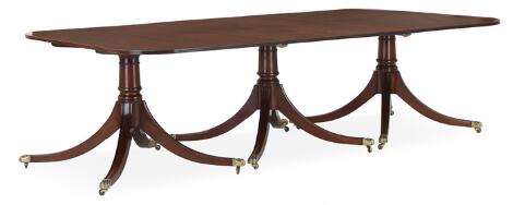 2551/3117LyngbyAn English three-pillar table of mahogany with two extension leaves. George III form, 19th century. H. 76 cm. L. 275/381 cm. W. 138 cm.