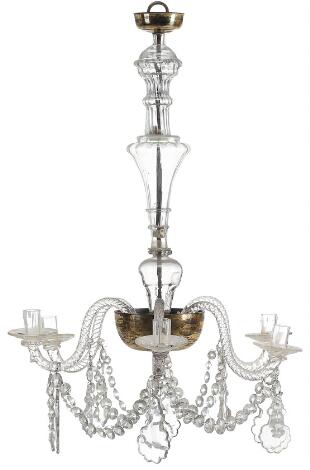 2551/3079LyngbyA Baroque glass chandelier with six candle holders composed of different parts. Partly 18th century. H. 102 cm. Diam. 75 cm.
