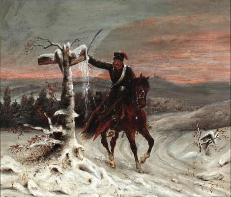 2545/8065Tysk maler, 19. årh.: To soldater til hest finder vej i et tilsneet landskab. Sign. v. Bistram 1887. 37 x 41 cm.