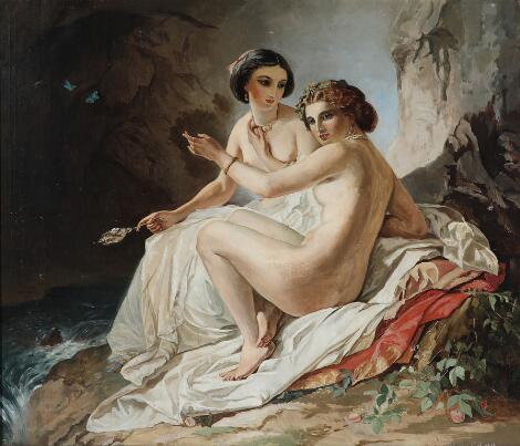 2545/8123Louis Hersent, efter, 19. årh.s slutning: Badende kvinder. Sign. H. Berkholtz. Olie på lærred. 114 x 132 cm.