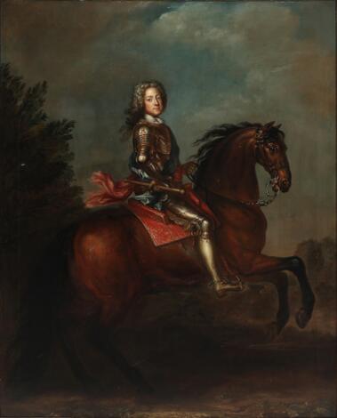 2545/8139Engelsk maler, 18. årh.s begyndelse: Kong Georg II af England (1683-1760) til hest. Olie på lærred. 127 x 104 cm.