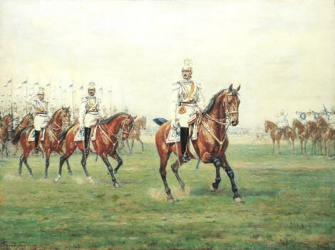 2545/8079Conrad Freyberg: Tropperevy med Prins Albert af Glücksborg. Sign. Conrad Freyberg 1909. Olie/lærred. 48 x 64 cm.