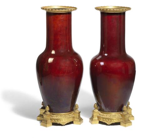 A pair of large French Louis XVI style baluster ox-blood glazed porcelain vases gilt bronze mountings. Late 19th century. H. 76 cm. (2)