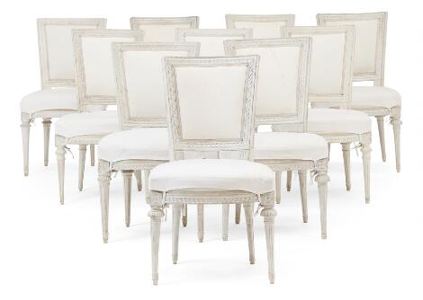 Et sæt på ti næsten ens gustavianske stole, LSH for Lars Söderholm, stolmager i Stockholm ca. 1785. Sverige, 18. årh.s slutning. (10)